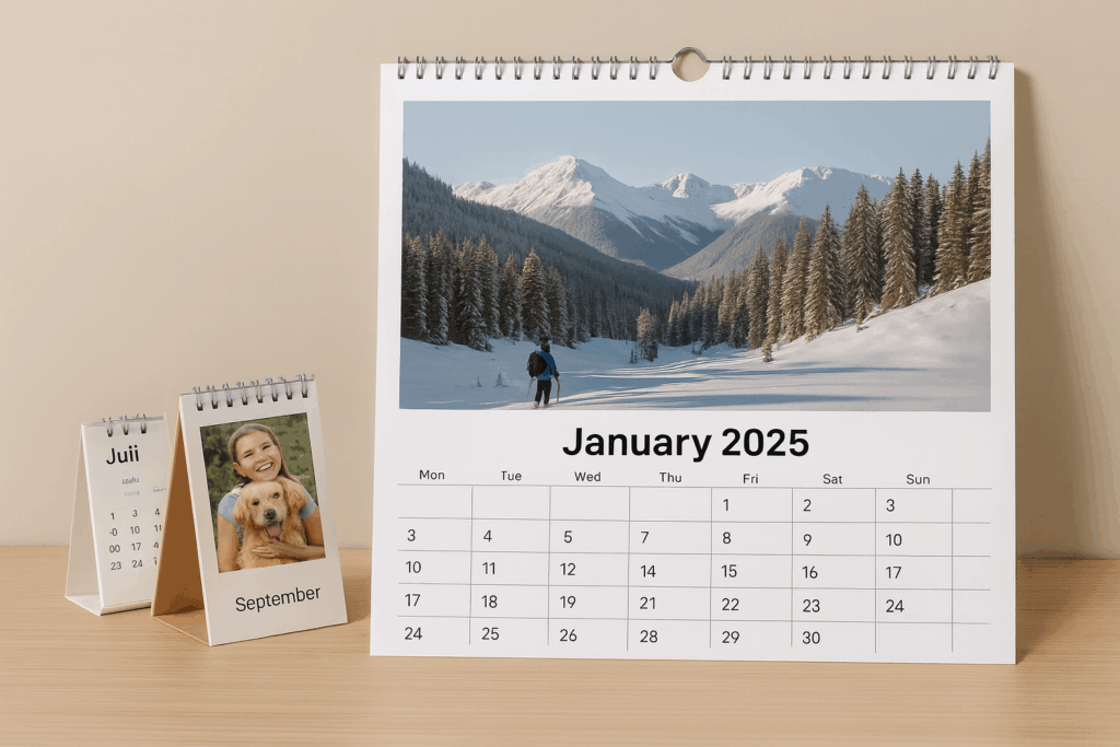 Von kompakten Tischkalendern bis zu großformatigen Wandkalendern: Je größer das Format, desto stärker die Bildwirkung. Flexible Layouts mit Collagen, Textfeldern oder individuellen Monatsüberschriften sorgen für persönliche Gestaltung.